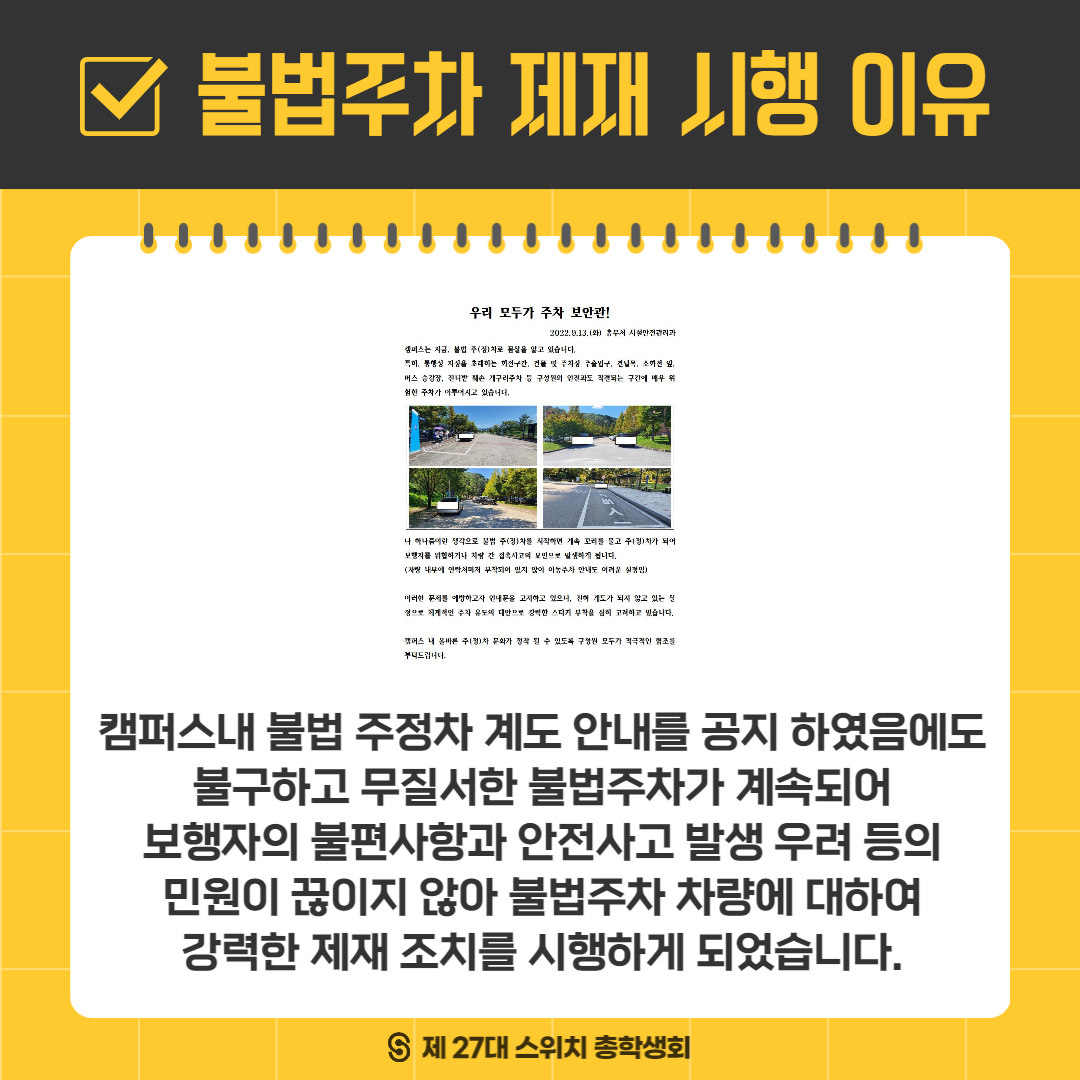 2022년 10월 3일부터 캠퍼스내 불법주차에 대해 강력한 제재 조치가 전면 시행됩니다.